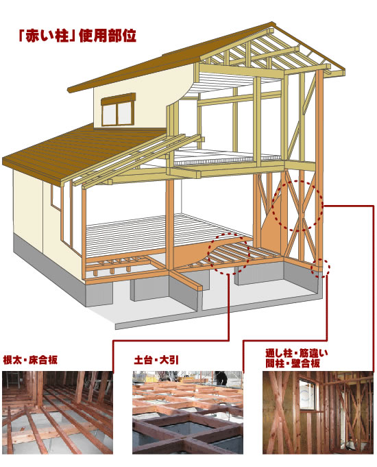 「赤い柱」では、住宅1階部分の部位ごとに、一定の基準を満たす材料をご使用いただくことで、
