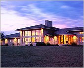 この現代住宅はグレートルームが中央にあり、ガラス一面で覆われた正面の壁からは大草原を望むことができます。