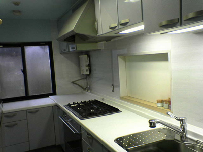 ★写真をクリックで拡大表示いたします!| 今回はシステムキッチンの施工です。 施工前の写真(上段)と比較して見てください。 施工前は奥に流し・ガスレンジ等がありその反対側に食器棚がありました。 新しく入替えたキッチン(下段)は対面型になり元の流し台スペースに食器棚を設置しました。白を基調にした清潔感のあるキッチンに生まれ変わりました。 |
